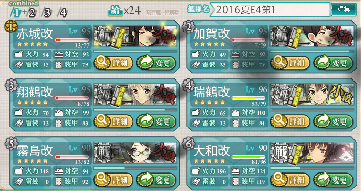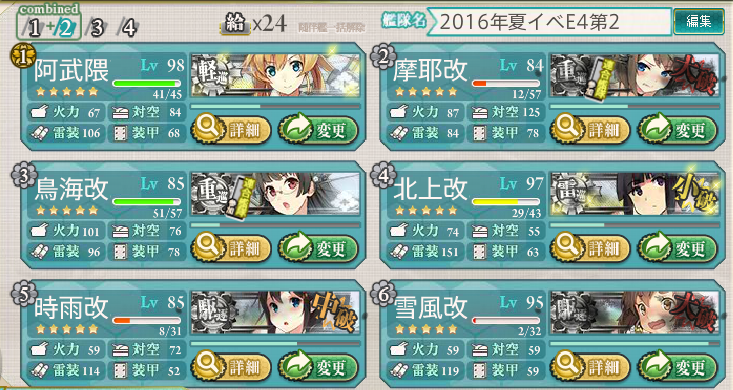 まだまだやれることもあったはず。実際、以下のような結構よい編成と装備(夜戦連撃orカットインも考慮)でしたし、何よりも引き際を誤ってました。