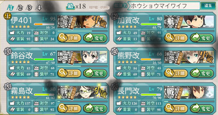 ようやくE-5を甲で突破… 編成はこんな感じでした。 とどめを刺したのが霧島ネキ改二。 でも、ドロップも霧島さん…嫌がらせか!!