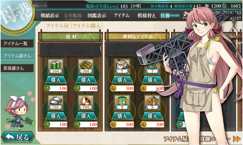 アイテム一覧から勲章→設計改装図を、の前にうわさの明石さんのところへ。