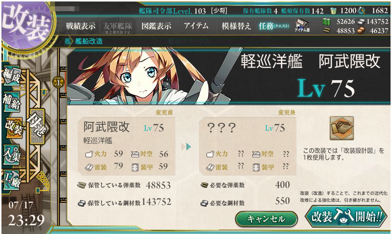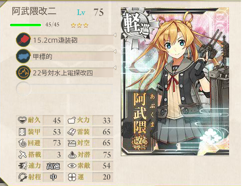 2015年7月17日のメンテで阿武隈が改二になると聞いていたので、その日までにLv.75まで上げてました。