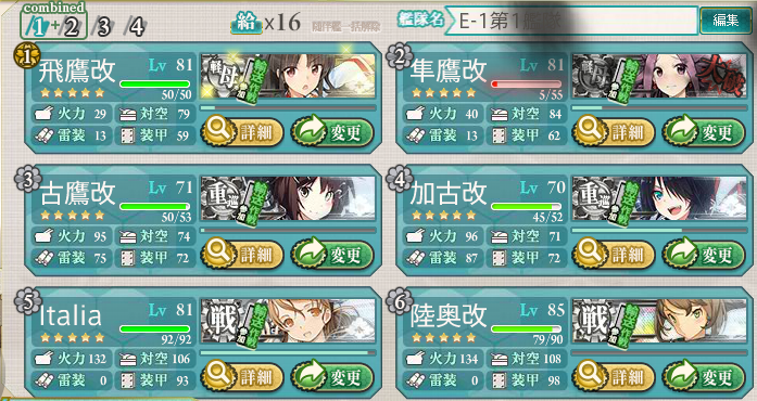 まずはE-1甲クリア、編成はこんな感じでした(連合艦隊:水上打撃部隊)。