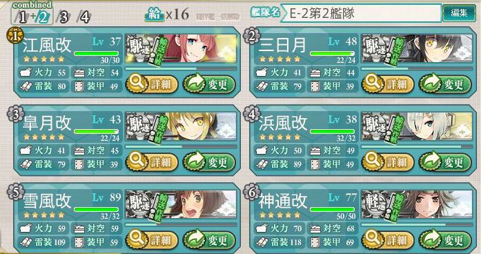 江風、三日月、皐月、浜風はレベルはあまり高くないですが、連合艦隊だとこれでも余裕でした。