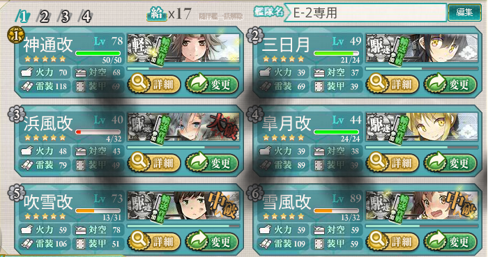 固定要員は神通・三日月、浜風、皐月、雪風、残りは主人公さんのブッキーこと吹雪で埋めました。