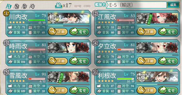 駆逐艦にはそれぞれドラム缶1個づつ、利根改二にはドラム缶×2と瑞雲(六三四空)×2を積み、輸送ゲージと攻撃のバランスを組んで出撃。